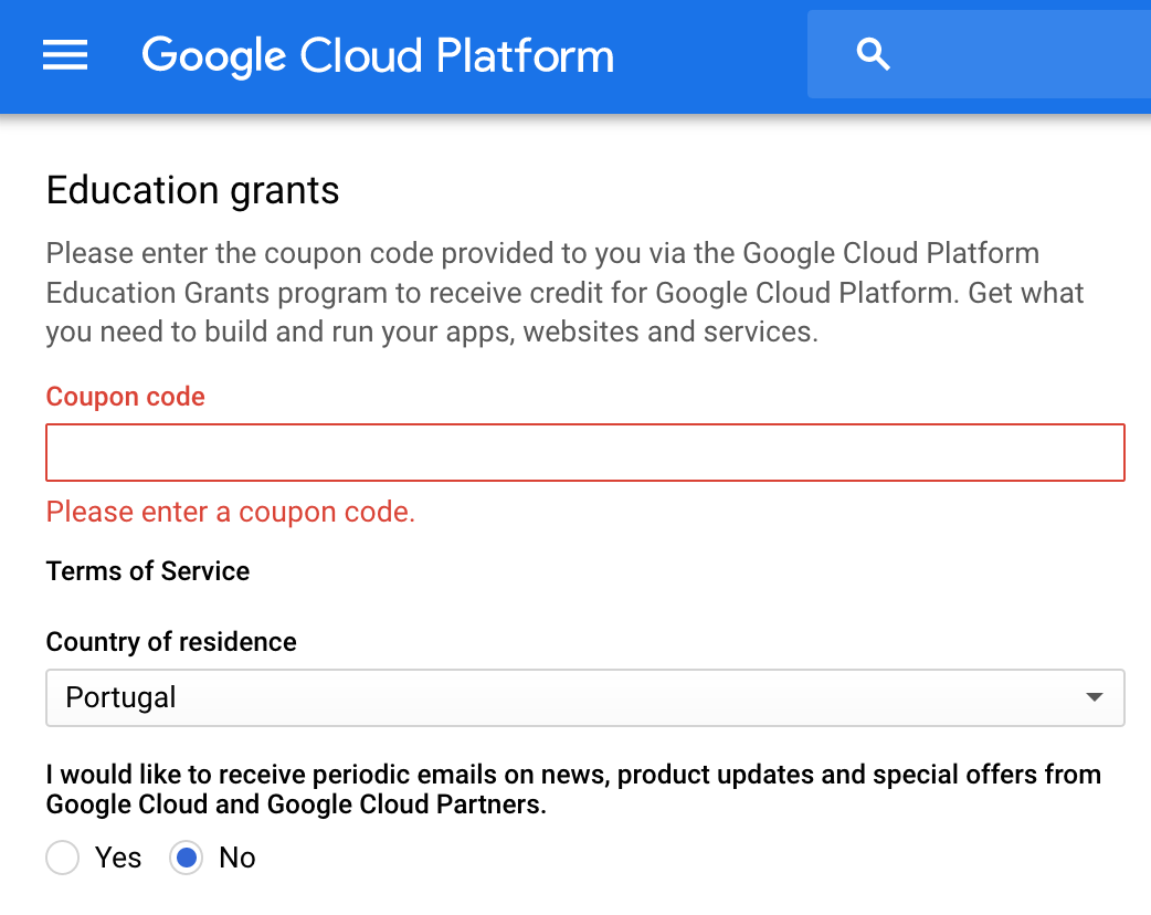 Click on the "Redeem" link. You will be redirected to GCP to fill in the coupon code.