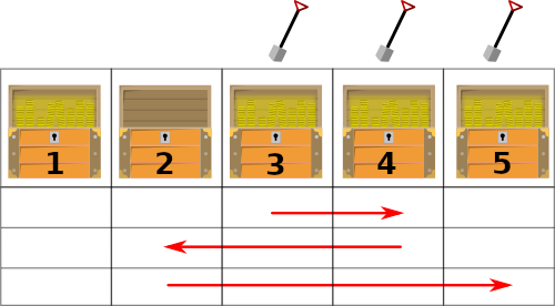 As she moves, she passes several chests and ends up collecting exactly 3 treasures, as shown on the following figure (collected treasures are marked with a shovel):